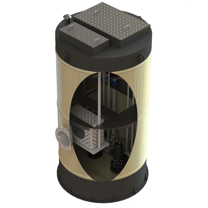 一體化預(yù)制泵站為交鑰匙工程,該泵站的筒體采用加厚型機(jī)械纏繞GRP玻璃鋼材質(zhì)制成的。內(nèi)部的水泵,管路,閥門,儀表,控制設(shè)備以及其它用戶所需要的附件成套提供,并安裝測(cè)試完畢后出廠。是一種使用方便,質(zhì)量可靠,土建工作少,成本較低的新型一體化泵站設(shè)備,容積優(yōu)化是其顯著的特征。模塊化濕井泵站:水泵采用自耦濕式安裝,水泵間和進(jìn)水井集成在同一個(gè)井筒內(nèi),帶內(nèi)部維修平臺(tái)和地面控制面板。要求操作及維護(hù)簡(jiǎn)單,在運(yùn)輸前進(jìn)行預(yù)裝和工廠測(cè)試,使現(xiàn)場(chǎng)安裝時(shí)間短,提高系統(tǒng)可靠性.